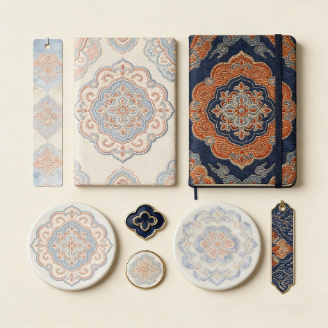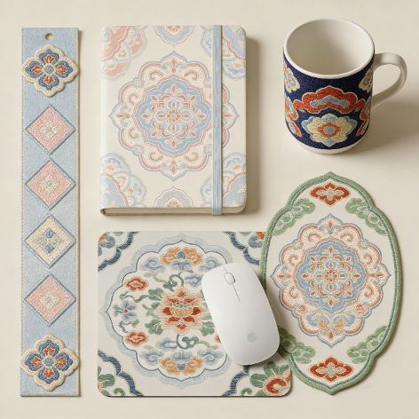 同时,团队紧扣青年审美与消费需求,探索AI辅助设计路径,将传统云锦元素“缠纹枝、云纹、卷草纹”等与年轻化设计理念相融合,开发出一系列兼具文化底蕴与实用价值的青年导向文创产品,让云锦文化融入日常生活。